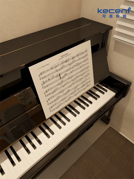 鋼琴區采用三盞防眩射燈(7W 36° 4000K)做洗墻照明,光弧清晰的小山丘打在墻上,增添了一份靈動感,讓人不禁想象著,那漂亮的小山丘就像是舞者的裙擺,它會隨著美妙的音符跳動起來,跳出動人的圓舞曲。