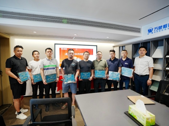會議尾聲,旺德府家居集團大客戶中心總經理湯科先生為多家企業授予萬象板材 、萬象天冠品牌“戰略合作伙伴”證書并合影留念,這不僅是品牌價值的深度融合,更以可視化的儀式感傳遞出萬象品牌構建行業生態共同體的戰略決心。