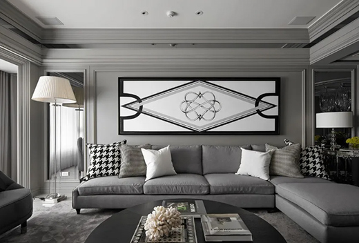 設計亮點:一幅超大的裝飾畫,詮釋了整個客廳的亮點,沙發背景墻還做了一些造型設計,與客廳吊頂相呼應。整體色彩以灰色為主,使客廳空間的視覺延伸更寬廣。