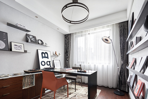 家里多處用到了這種圓形鏤空吊燈,設計感極強,黑色的書桌略顯質感滿滿,一切顯得簡單一些。