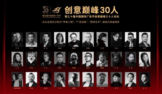 今年是第30屆中國國際廣告節,過去30年,是廣告行業大跨度的30年,也是創意藝術蓬勃發展的30年。中國國際廣告節創意巔峰30人覆蓋了過去30年間具有代表性商業作品及卓越藝術成就的創意人、藝術家及意見領袖,最終遴選出今年的30位獲獎者。